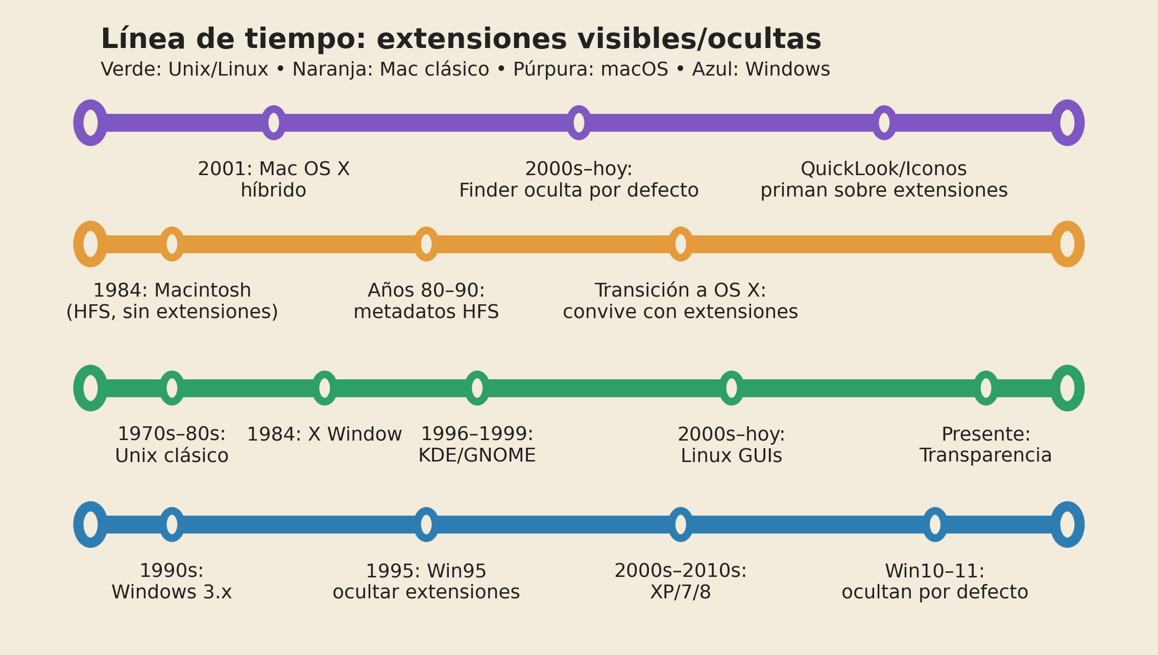 - X Window System (1984): primeras GUIs en Unix; mostraban nombres completos, extensiones incluidas.