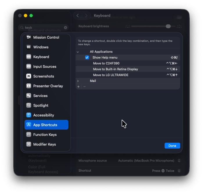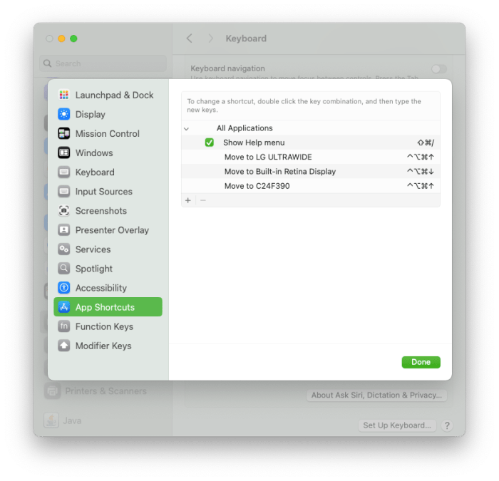 Sin embargo, el shortcut tendía a «alterarse» (desaparecía en su totalidad o alguno de sus elementos), muy posiblemente por algún conflicto. Por lo que opté por diferenciarlos (y hacerlos un poco más ad hoc a la posición física de cada pantalla).
