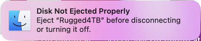 Tenía rato que el mensaje «Disk not Ejected Properly» no había vuelto a aparecer en la M1, al menos no de manera tan insistente como desde la última vez que escribí de esto. Este es un tema recurrente. Basta que uno haga un «gugleo» para ver que hay mucha gente que pregunta por soluciones al respecto. Similarmente, mucha gente responde apuntando al manejo de energía y al evitar que el sistema se duerma cuando la pantalla se apague por inactividad (una opción que ha venido cambiando de nombre y ubicación a lo largo de las distintas versiones de Mac OS X, OS X y macOS). Esto, creo que resuelve muchos de los casos, pero hay algunos que no, como ha sido mi caso.