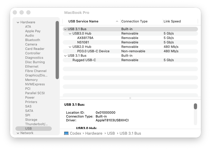 Como podrá observarse, no se detecta ningún dispositivo Thunderbolt y las interfaces USB indican una conexión de 5 Gb/s. Ciertamente, ya había olvidado que aunque el Rugged cuenta con una interfaz USB-C que no da más de 5 Gb/s.