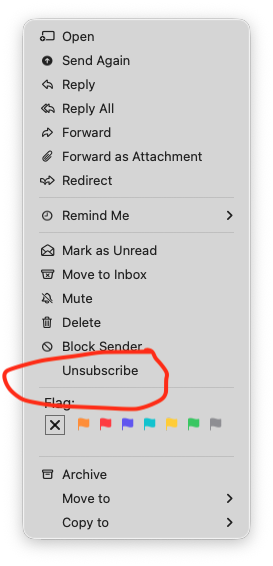 Mail llega a identificar la opción para dejar de recibir mensajes que algunos remitentes ofrecen, y esta opción aparece en el menú contextual del mensaje seleccionado. Pero esto no siempre ocurre, por lo que he estado desarrollando un par de applescripts para agilizar un poco más el proceso.