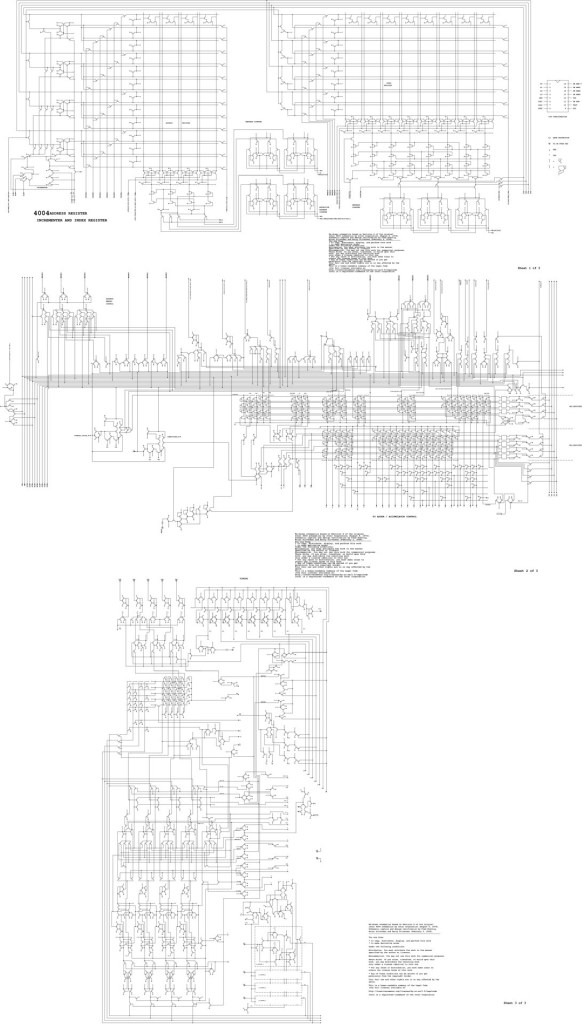 El Intel 4004 fue el primer microprocesador en un chip y el primero en estar comercialmente disponible. Se trata de una CPU de 4 bits. Algunos de sus diagramas de diseño se muestran a continuación.