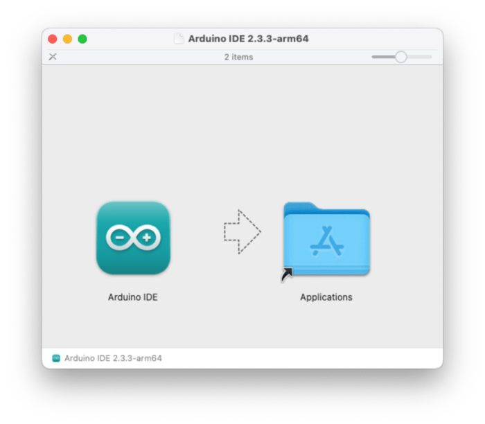 De la página de Arduino la versión del IDE adecuada para el sistema operativo y procesador. Para el caso de macOS, el instalador es una imagen de disco y puede procederse en «la forma mac«. Si bien el instalador sugiere una carpeta «Applications«, que se asume es la del sistema, la aplicación puede arrastarse también a la carpeta Applications del usuario que instala.