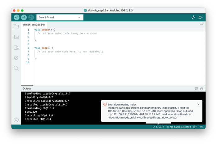 Una vez instalado el IDE, cuando se abra por primera vez, veremos que se activa un proceso de instalación de lo que parecen ser bibliotecas de desarrollo. Al parecer, el sitio de Arduino tienen una alta demanda, ya que tanto la descrgar del IDE como de las bibliotecas presentan frecuentes desconexiones.