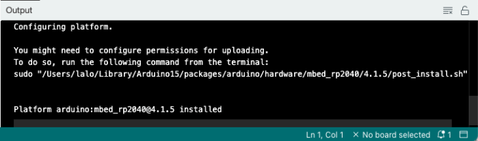 El equivalente del primer programa probado usando Python. Está basado en el código de ejemplo (Blink) que aparecerán después de agregar la tarjeta al IDE (ver sección Raspberry Pi arriba). Dicho programa indica estar hecho para activar el LED que está interconstruido en la RB pico pero no funciona algo le falta.