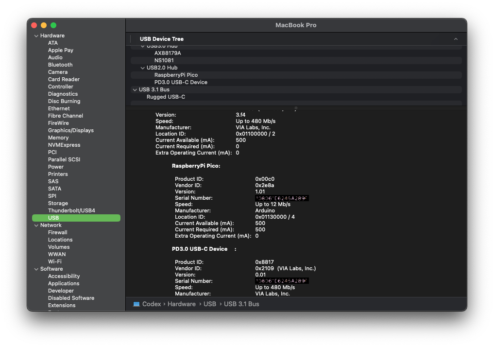 Al margen de lo anterior, y para el caso de macOS, puede resultar de interés para algunos el porqué del nombre del puerto USB. Si uno se va al profiler del sistema > About This Mac > … > System Report…, uno verá, en la sección Hardware > USB, el Location ID con dicho valor (en la imagen con la RB Pico conectada al puerto en cuestión.