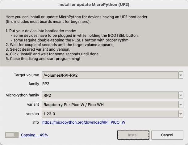 Al hacer clic en el enlace «Install or update MicroPython«, aparecerá un formulario con algunos valores pre seleccionados, de no ser así ajustarlos manualmente y dar click en Install.