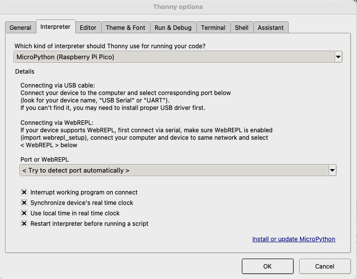 Thonny permite hacer la instalación de MicroPython. Desde la opción Run del menú, seleccionar Configure Interpreter. Del formulario que se presentará, seleccionar la pestaña Interpreter (en caso de que no sea mostrada por defecto) y seleccionar las opciones como se muestran a continuación: