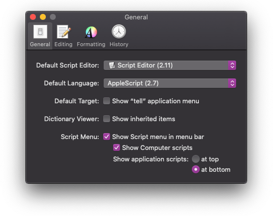 En el menú principal, se puede contar con un ícono que permita ejecutar ciertos scripts de utilidad (ícono de más a la izquierda en la imagen de arriba). Los scripts disponibles varían de versión a versión de macOS y de las aplicaciones en ésta. Éste se activa desde las preferencias del Script Editor.