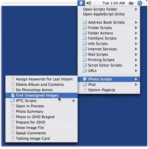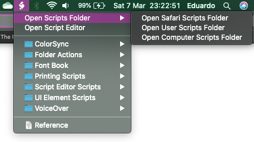 En el menú principal, se puede contar con un ícono que permita ejecutar ciertos scripts de utilidad (ícono de más a la izquierda en la imagen de arriba). Los scripts disponibles varían de versión a versión de macOS y de las aplicaciones en ésta. Éste se activa desde las preferencias del Script Editor.