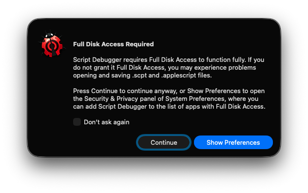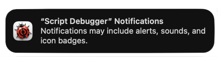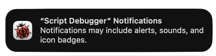 La primera vez que Script Debugger es usado generará algunos mensajes de advertencia y pedirá terminar su configuración, lo que incluye: