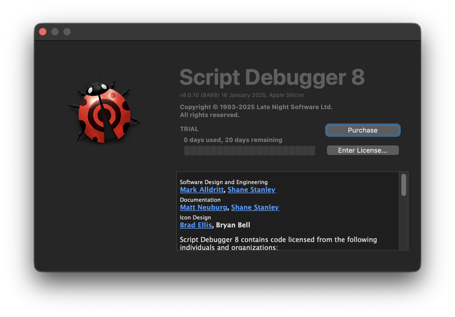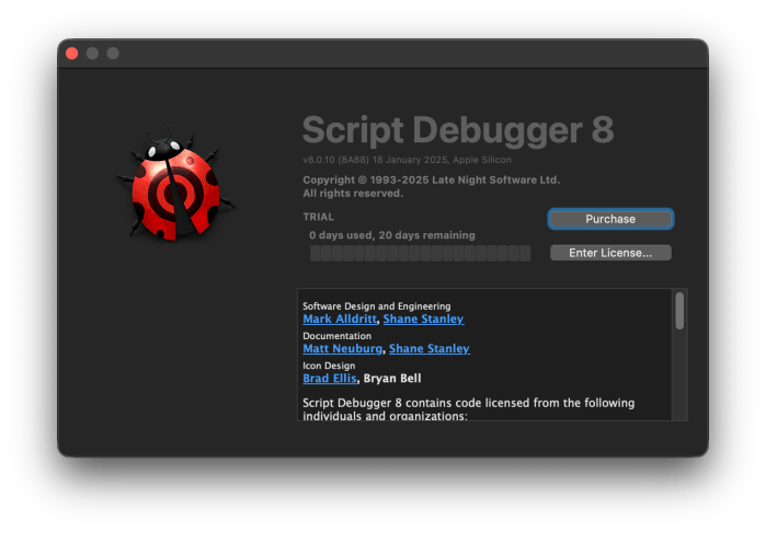 - «Retiring Script Debugger«, latenaightsw.com, web. Published: 2025.01.01; visited: 2026.03.15. URL: https://latenightsw.com/retiring-script-debugger/.