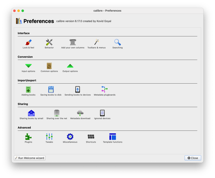 El plugin se instala desde las preferencias de Calibre, para las que hay varias formas de llegar a ellas a través de la interfaz de esta aplicación.
