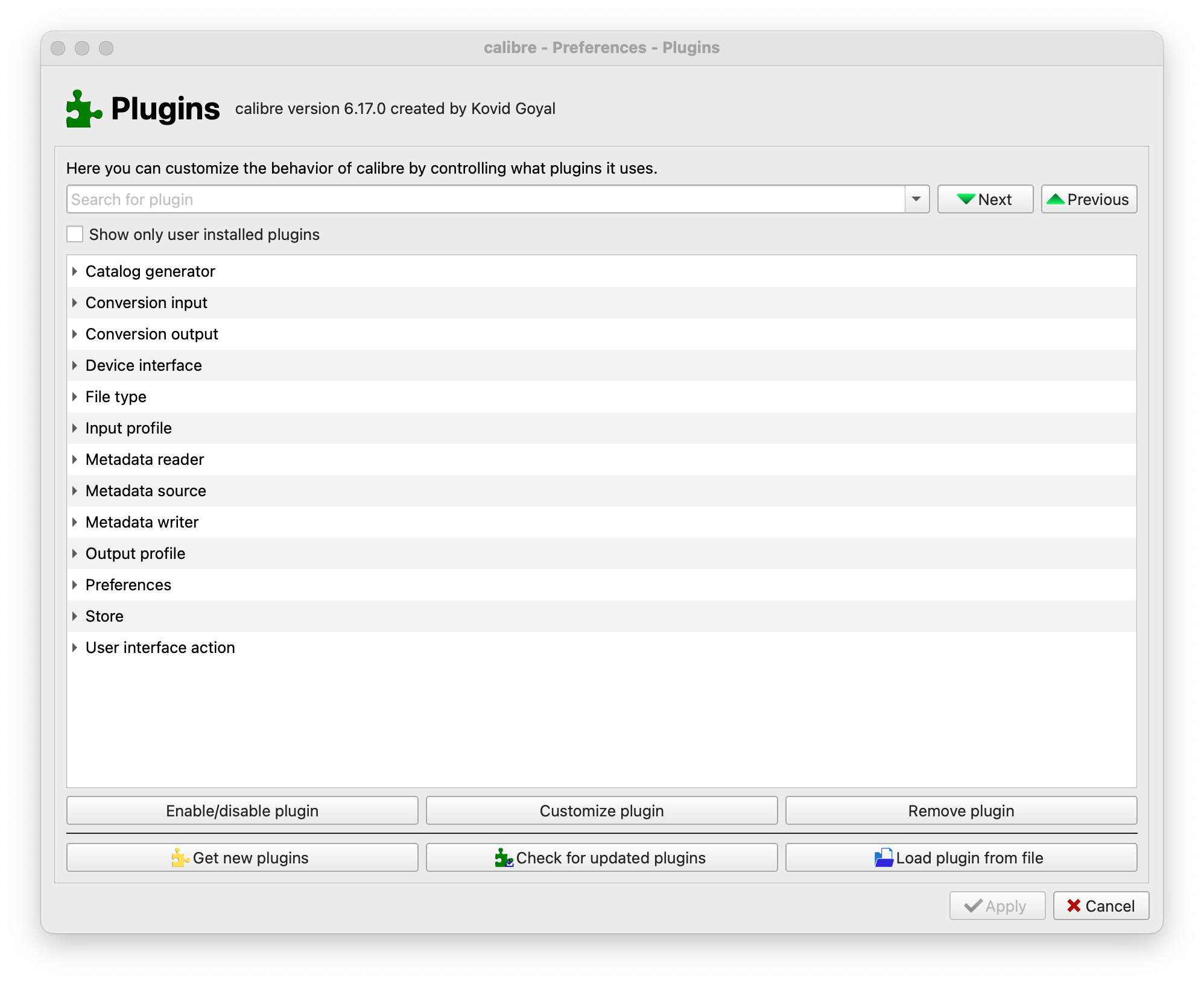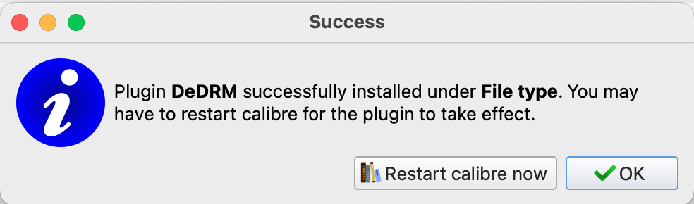 En las preferencias se selecciona Plugins y se hace click en el botón «Load plugins from file«. Se busca y selecciona el archivo ZIP mencionado. Un par de advertencias serán mostradas y la instalación requerirá que se reinicié a Calibre.