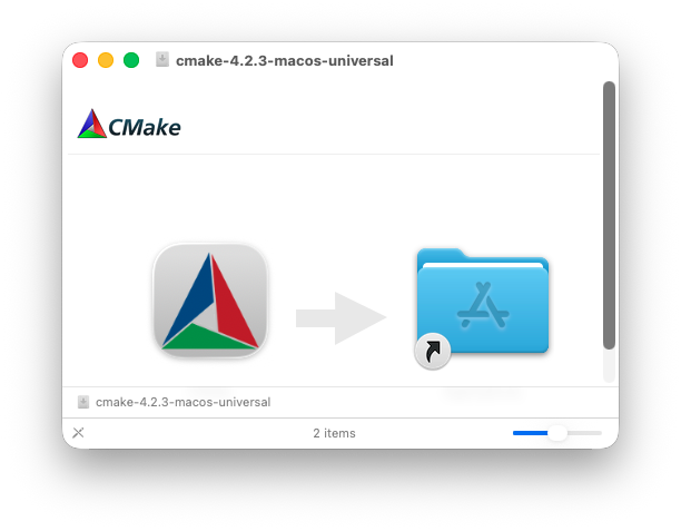 En la página de descargas se selecciona la distribución para el sistema operativo y el procesador. En el caso de macOS, el formato de la imagen es «universal». Una vez montada la imagen de disco (.dmg), bastará arrastrar el icono de CMake al alias de Applications para llevar a cabo la instalación.