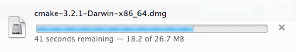 Una vez descargado, la instalación consistirá en montar la imagen del disco (es decir, abrir el archivo de extensión .dmg), aceptar la licencia y convenios del software, para finalmente, arrastrar el icono de CMake al icono del alias de Applications.