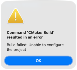 Para construir un proyecto en VS Code se recurre a la paleta de comandos (⬆ + ⌘ + P ) y se busca CMake: Build…, con esto deberá empezar el proceso de construcción. En caso de que aparezca un mensaje de error como el mostrado abajo, se debe a que CMake no figura en el path de búsqueda de programas.