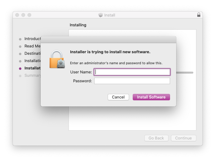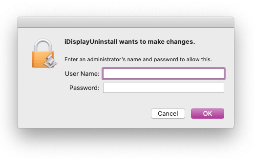- Las siguientes dos ventanas aparecen casi simultáneamente. Antes de introducir las credenciales administrativas, es necesario atender el acceso desde System Preferences.