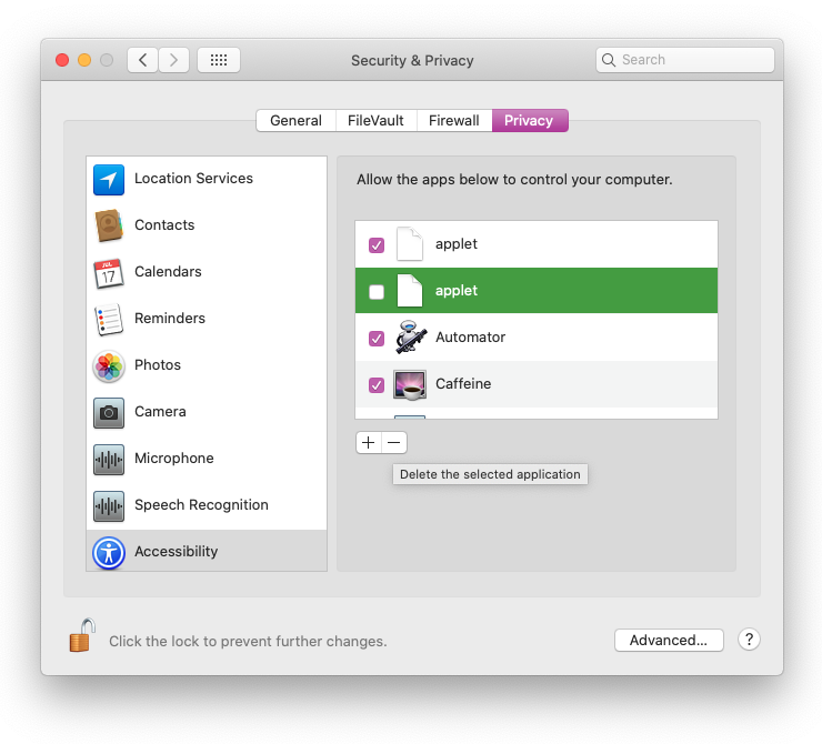 Como medida de limpieza (y más en caso de haber intentado o hecho varias veces la desinstalción), conviene regresar a Security & Privacy en System Preferences y borrar el acceso al o los applets que ahí aparezcan.