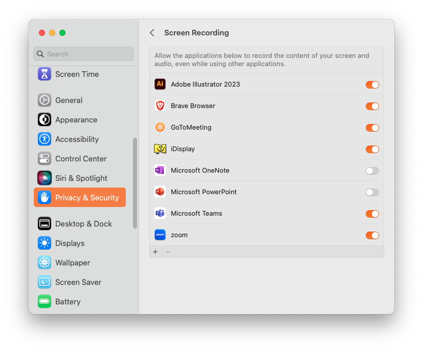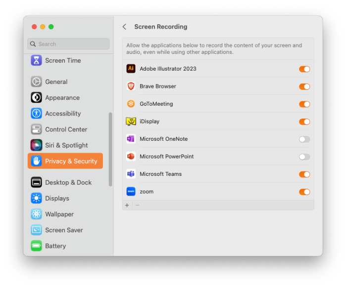 Para el caso de macOS 13 «Ventura«, adicionalmente, es necesario dar permisos de grabación e la pantalla (System Settings > Privacy & Security > Screen Recording).