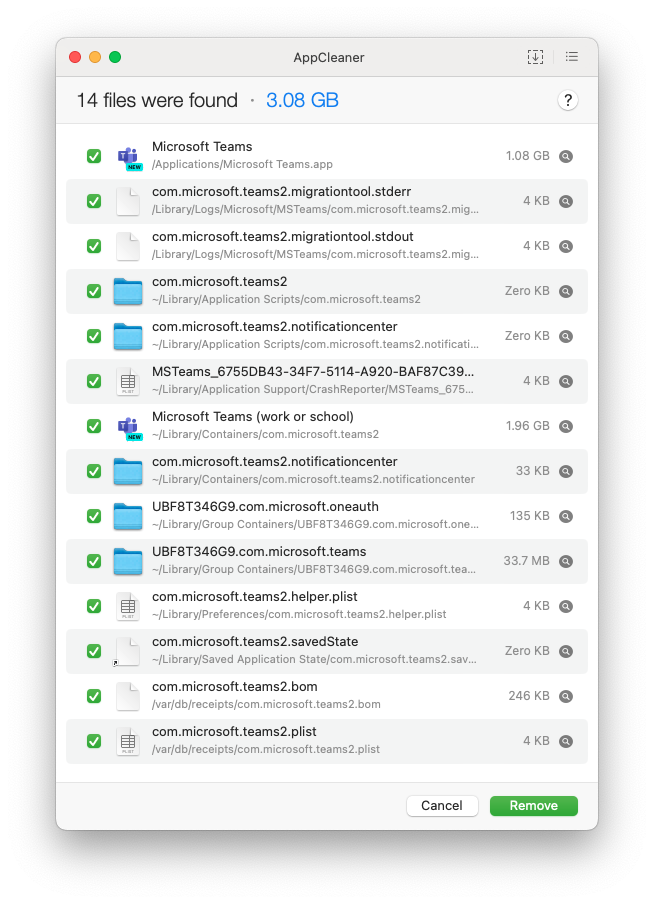 Una desinstalación completa de Microsoft Teams, implica más acciones que la de sólo mover a la aplicación al «Trash can«. AppCleaner reporta los siguientes componentes a remover: