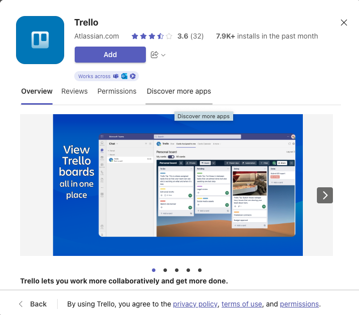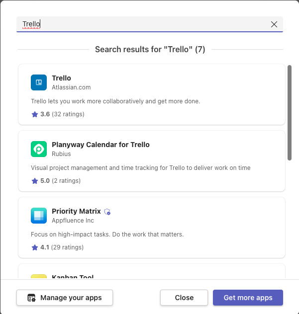 - Desde Apps > Manage your apps, buscar Trello.
