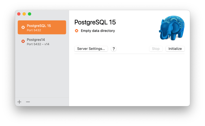 Hay varias opciones1 en la forma como PostgreSQL puede ser instalado en macOS. Unas son «pesadas» por la cantidad de elementos que son descargados e instalados. Otras son menos complicadas y muy simples. La diferencia, al final, será con lo que uno se quede adicionalmente al manejador de bases de datos. La decisión sobre cuál de ellas elegir consiste en si se llevarán actividades de desarrollo con el SMBD o si simplemente será usando como un servicio que se usa para almacenar y recuperar datos.