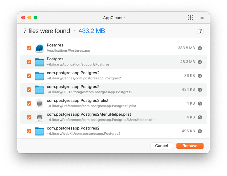 Aunque se indica que la instalación de postgres.app se puede llevar a acabo moviéndola al Trash y llevando a cabo algunas acciones adicionales2, conviene antes ver lo que un removedor de aplicaciones puede detectar para también eliminarlo (ver sección Actualizaciones en el apartado de Actualizaciones de postgres.app)