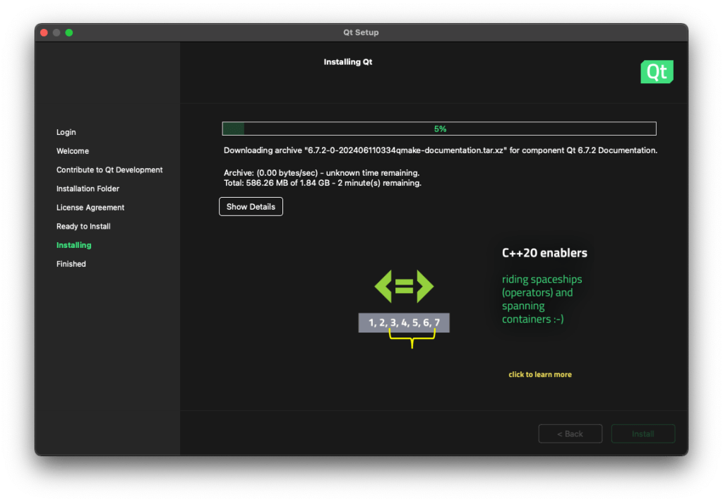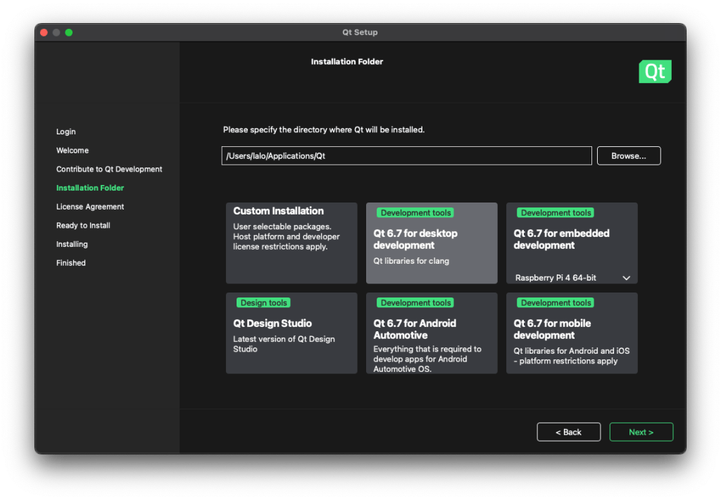El instalador realmente descarga lo necesario según se va indicando el tipo de instalación que uno busca (que en este caso corresponde a un «desktop development«). Un punto que llama la atención es un aviso sobre la necesidad de tener instalado Xcode (aunque ya se contaba con él). Otro punto en el que hay que tener cuidado es cuando se selecciona el directorio destino (donde ya sea que se acepte el propuesto o que se cree uno vacío en otra ruta).