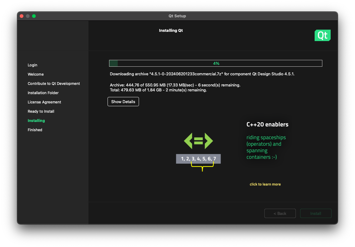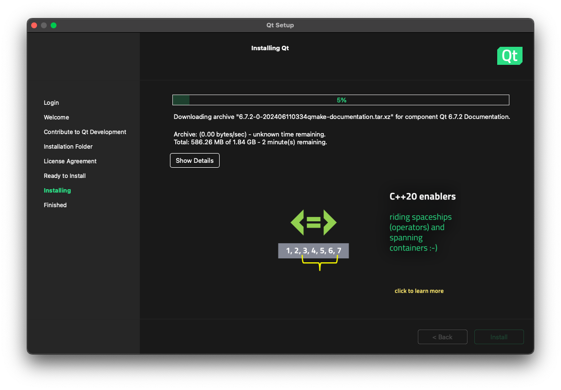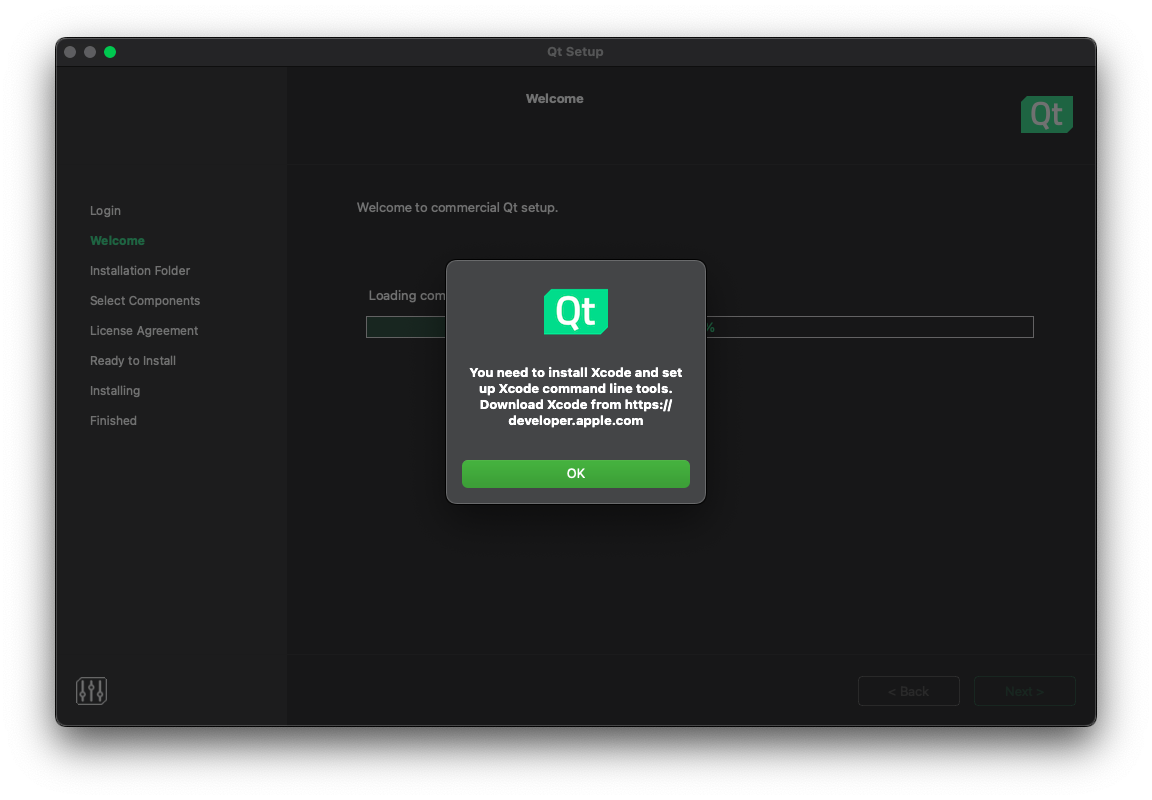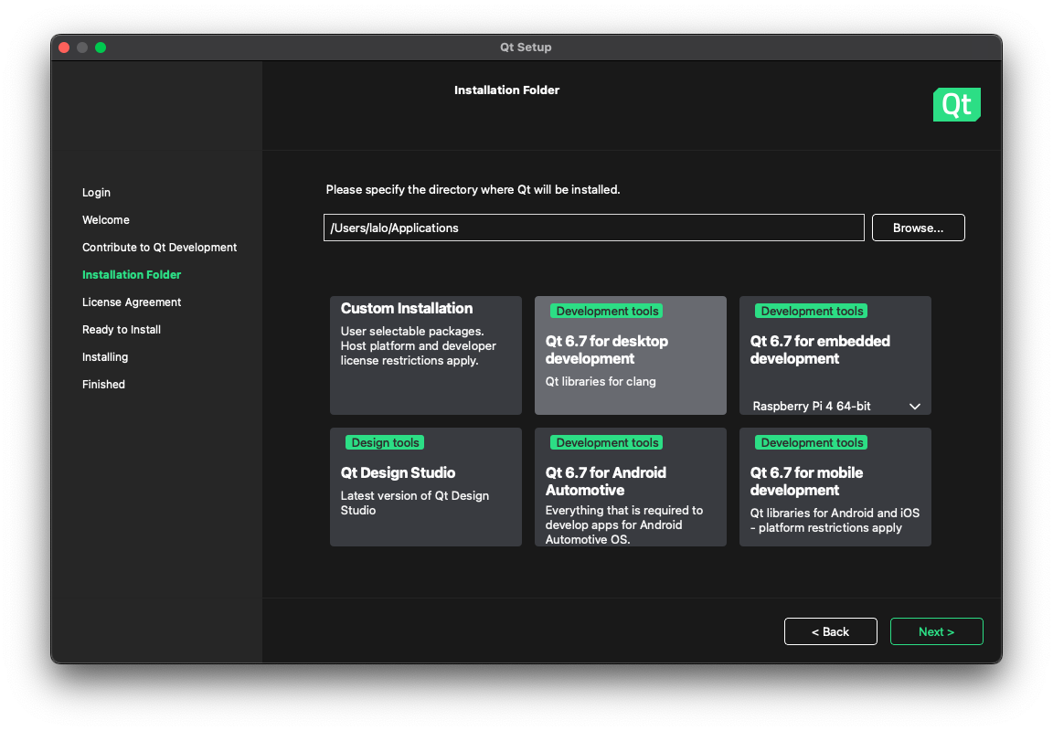 El instalador realmente descarga lo necesario según se va indicando el tipo de instalación que uno busca (que en este caso corresponde a un «desktop development«). Un punto que llama la atención es un aviso sobre la necesidad de tener instalado Xcode (aunque ya se contaba con él). Otro punto en el que hay que tener cuidado es cuando se selecciona el directorio destino (donde ya sea que se acepte el propuesto o que se cree uno vacío en otra ruta).