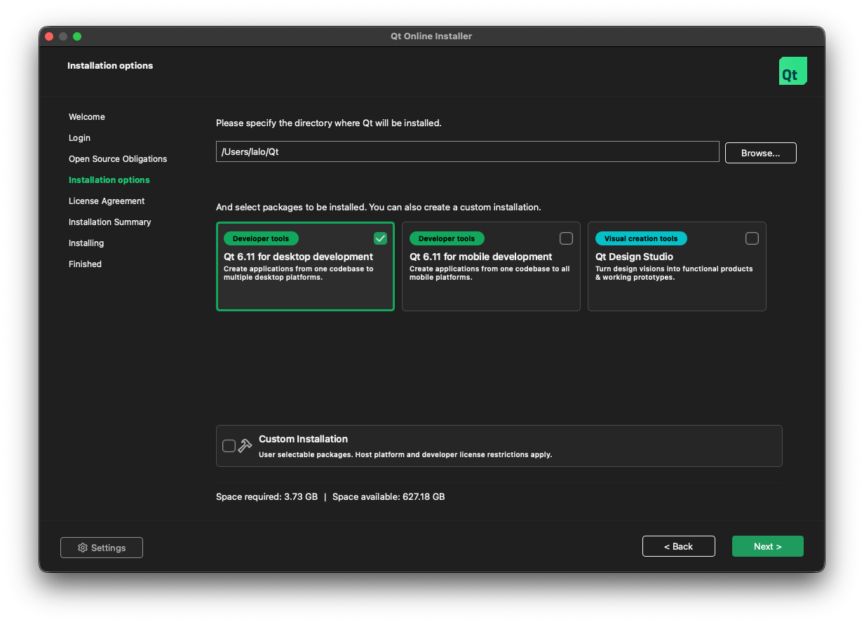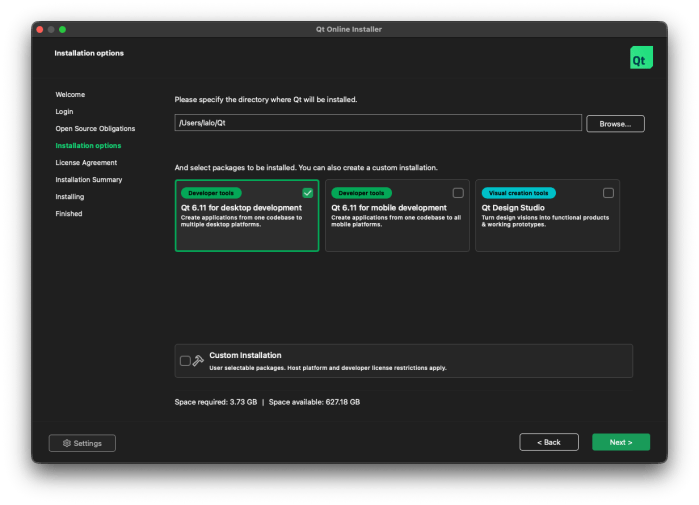 Como destino de la instalación se seleccionó /Applications/Qt. Al término de la instalación, quedando la barra de progreso en 99%