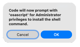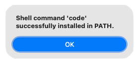 Ya sea desde la entrada del menú principal View > Command Palette, o con el atajo de teclado ⌘ + ⬆ + P, buscar «Shell Command: Install ‘code’ command in PATH» (escribirlo sin comillas). Esto llevará a las siguientes acciones: