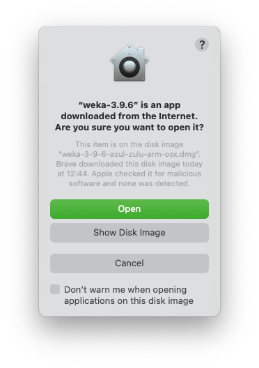 Al hacer uso por primera vez del Weka, una alarma sobre su origen aparecerá.