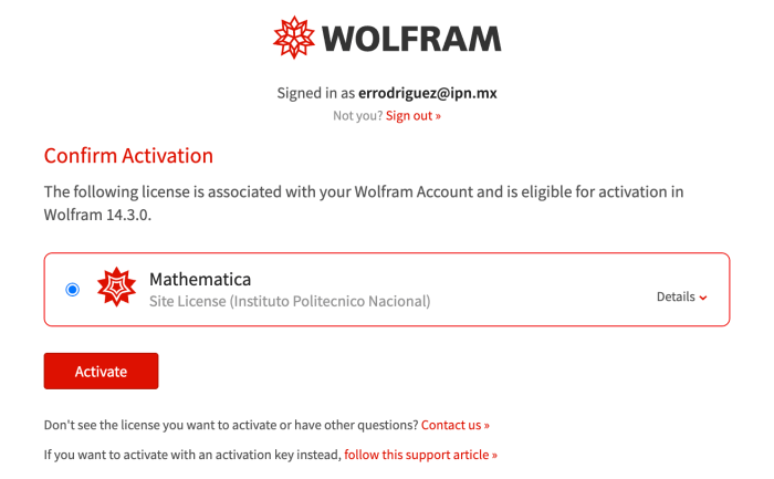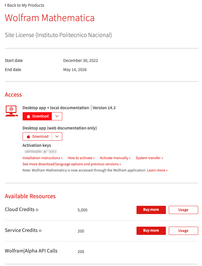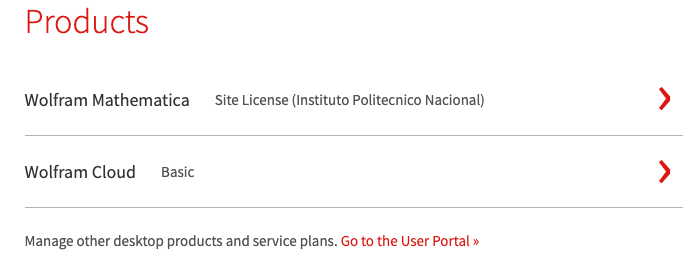 Varias instituciones educativas en México cuentan con licencias institucionales que permiten a todos sus estudiantes descargar o utilizar diversos productos o servicios en línea. Para ello, uno debe contar con un buzón en el dominio de dicha institución y validar el buzón. Esto proporcionará información y enlaces para abrir una cuenta en Wolfram Research y, a partir de entonces, se tendrá acceso a los servicios y productos contratados.