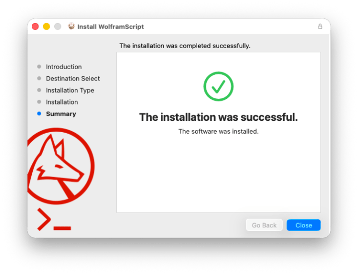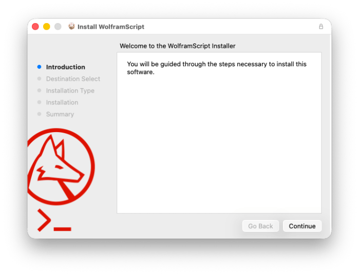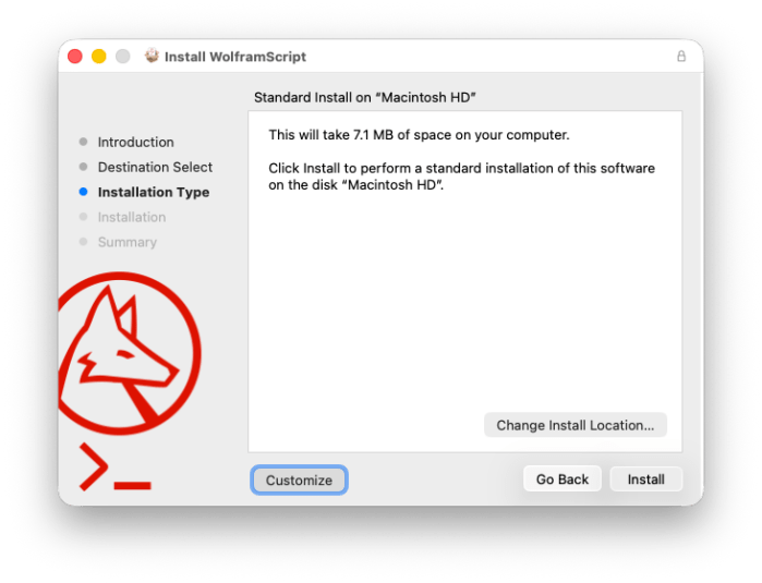 La instalación de WolframScript se inicia haciendo doble clic en el icono del instalador. La imagen de disco donde se encuentra este instalador es la que resulta del proceso de descarga del producto (ver la descripción de la instalación de Mathematica para más información).