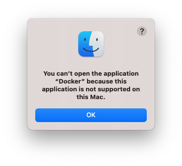 Antes de iniciar la instalación, conviene tener presente la versión de macOS en la que se busca instalar la aplicación, ya que Docker sólo soporta la versión vigente y dos más previas. Adicionalmente parece que Docker se rehusa a mantener disponible para su descarga las versiones ya obsoletas de su producto9. De descargar una versión no soportada, el DMG mostrará algo como esto: