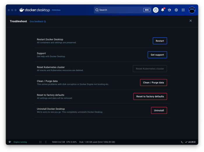 uno podrá disponer de tres opciones para buscar eliminar todo lo que Docker pudiera traer o generar. Las opciones son Clean/Purge data, Reset to factory defaults, y Uninstall. Considero que conviene aplicarlas en dicho orden. La opción Uninstall, al parecer sólo detiene procesos y quizás retire algo más, dejando la aplicación sólo para arrastrarla al Trash.