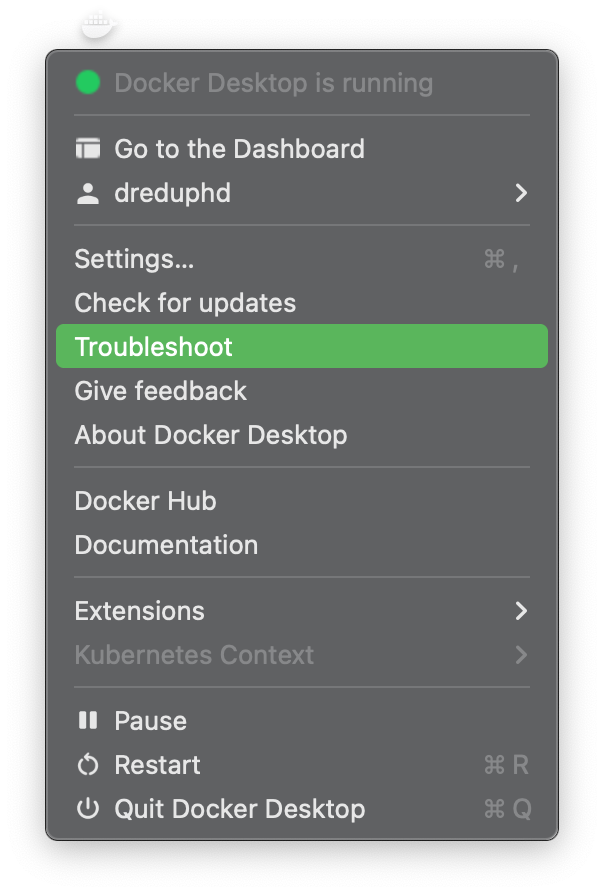 Ya sea desde la opción Troubleshoot del menú generado por el ícono de Docker en el menú principal