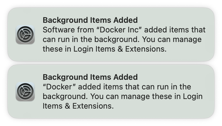- «Docker Desktop release notes«, Docker, Inc., web. Visited: 2024.07.11. URL: https://docs.docker.com/desktop/release-notes/. macOS 10.15: https://docs.docker.com/desktop/release-notes/#4150.