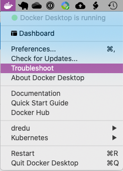 Ya sea desde la opción Troubleshoot del menú generado por el ícono de Docker en el menú principal