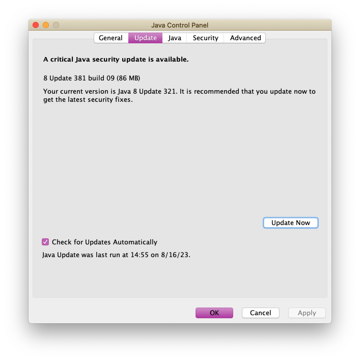 Al tratar de actualizar Java un mensaje de error es mostrado sobre una conexión XPC malograda. Las imágenes muestran los pasos seguidos desde el panel de control de Java para su actualización, descarga y el intento fallido de remoción. Aunque no es una solución4, quizás el mejor curso de acción es proceder son su desinstalación1-3 y reinstalación.