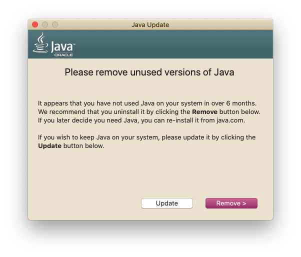 Oracle proporciona un desinstalador (el cual no está preparado para el «modo obscuro», el dark mode, del Finder y bajo éste no se ven los textos). Este desinstalador no funciona, por cierto (¿estará hecho en Java?). Así que sirve para nada y algo menos que eso.