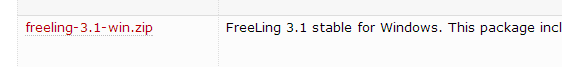 - Desde la página de descarga se selecciona la opción de descarga del paquete Freeling 3.1 para Windows y que está preparado para instalación sin necesidad de compilación adicional.