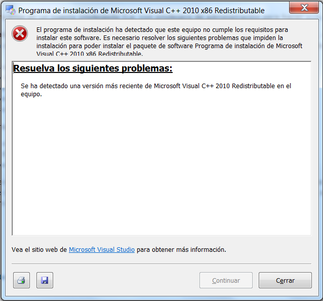 - En el documento se indica la necesidad de instalar las bibliotecas de redistribución de Microsoft Visual C++ 2010. El enlace para obtenerlas se proporciona también. Si se desconoce si se cuentan con éstas puede validarse en el Panel de Control del sistema, opción de Programas y Características.